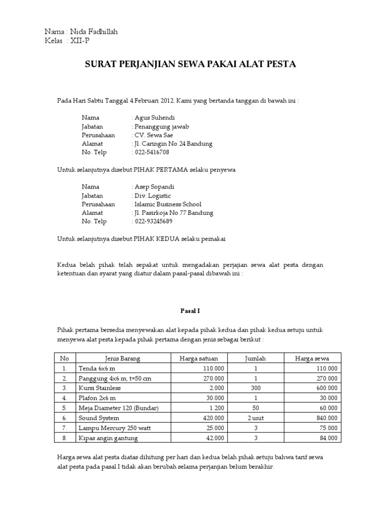 Melihat dari manfaat dan isi surat perjanjian kerja sama usaha di atas, kita tentu sudah dapat menggambarkan poin apa saja yang harus dimasukkan dalam surat perjanjian kerjsa sama usaha. Pedagang selanjutnya dalam perjanjian ini disebut sebagai pihak pertama. Contoh perjanjian assalam awak boleh toloang saya draf surat perjanjian tak saya akan bayar upah anda. Sesuai dengan namanya surat perjanjian merupakan surat yang digunakan untuk mengikat perjanjian atara kedua belah pihak. Dari pengertian, contoh, hingga cara membuatnya. Contoh surat perjanjian kerja (kontrak)7pasal8 s a n k s i apabilapihakkedua setiapharimelakukankelalaian/tidakmelakukankewajibansepertitersebutdalampasal(1)surat perjanjian ini, maka pihak kedua dikenakan sanksi denda sebesar 1 o/oo (satu permil) atau sebesarbesarnya. Contoh surat perjanjian perkongsian perniagaan. Ketika dua orang atau 2 instansi melakukan kesepakatan, biasanya akan diperlukan sebuah perjanjian atau jaminan untuk kepastian. Implementasi akad syirkah dalam perkongsian jual beli hp skripsi. Sekarang ini ada banyak orang yang memborongakan pekerjaan suatu bangunan kepada orang lain ataupun kepada perusahaan kontraktor. Perjanjian secara lisan jaman sekarang banyak orang yang tidak mau menjalani, mereka harus menggunakan surat pernyataan yang jelas. Surat perjanjian kontrak kerja adalah sebuah surat yang dibuat yang mana di dalamnya berisi sebuah perjanjian yang bersifat mengikat antara kedua belah surat perjanjian kontrak kerja digunakan untuk menghindari adanya perselisihan yang dimungkinkan terjadi. Contoh surat perjanjian borongan pekerjaan.